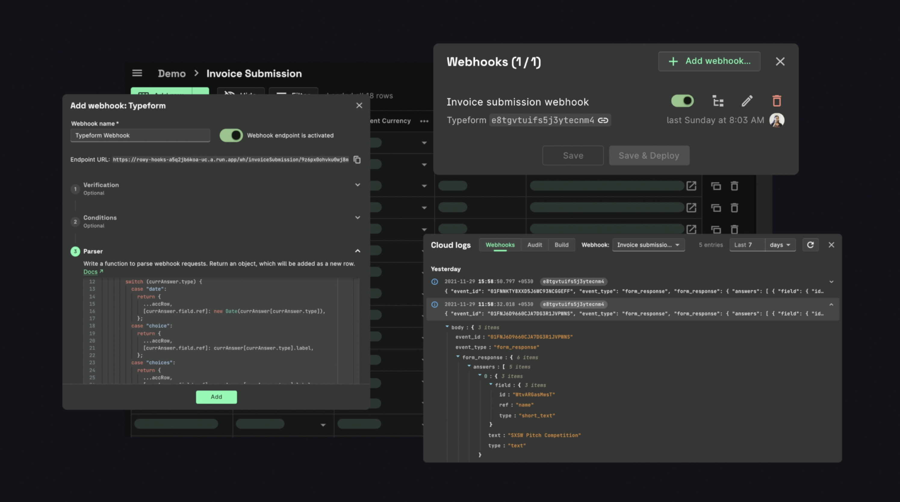 Spin up webhook endpoints instantly in your browser to consume data from any tool into your database.